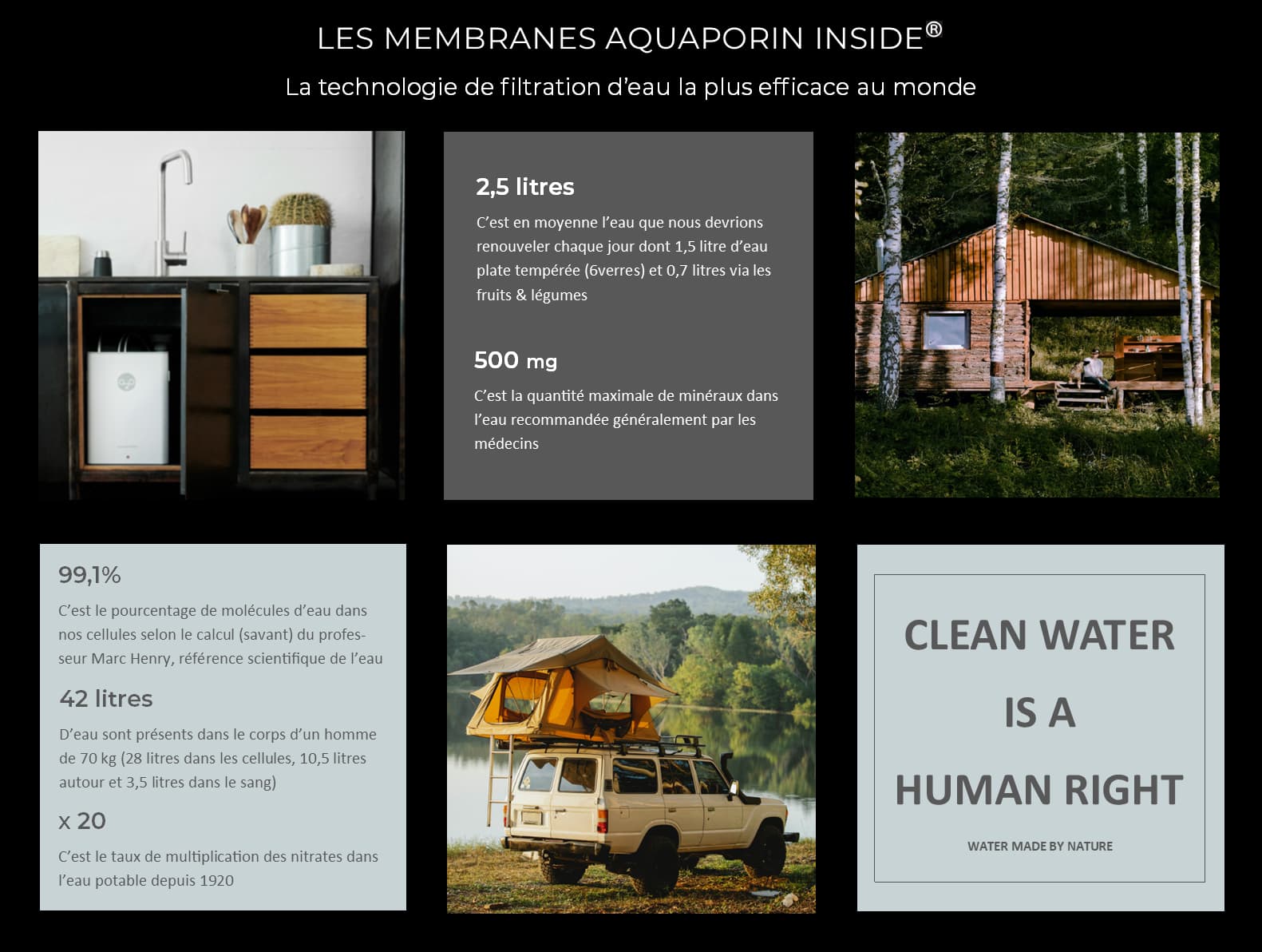 Avec la technologie Aquoporin Inside® A2O Pure est le purificateur d’eau partfait et peu encombrant qui offre les taux d’élimination les plus élevés pour les contaminants de l’eau. :